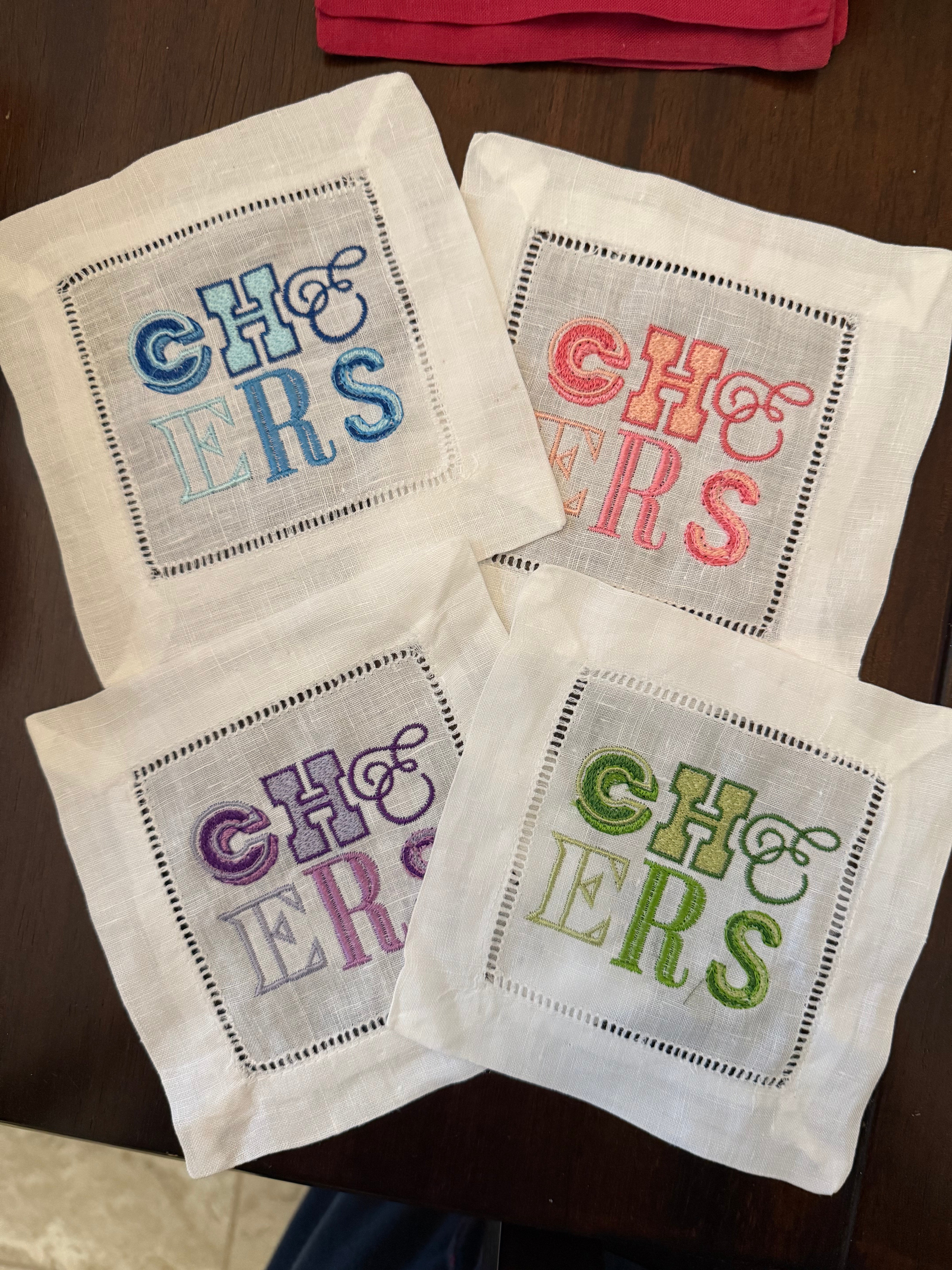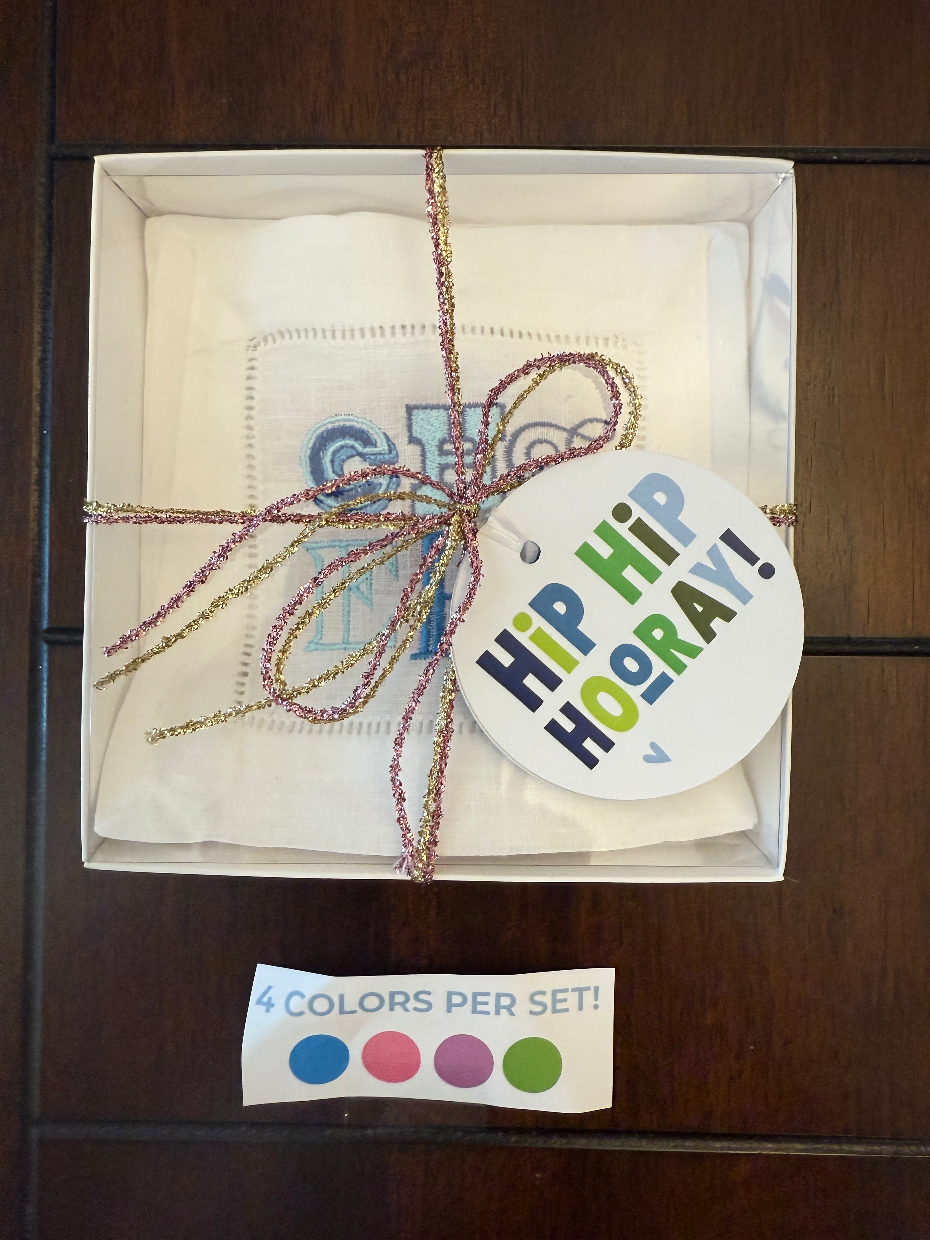 Set of 4 Embroidered Linen Cocktail Napkins | Wrapped with ribbon & a Gift Tag - the perfect hostess gift!